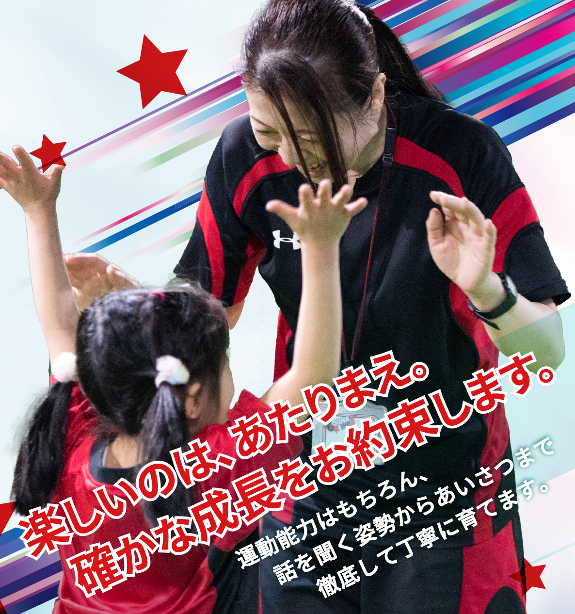 通い始めてからは、自分から挨拶ができるようになったり、目を見て話しを聞くという当たり前だけどなかなかできないことを自然とできるようになりました。 レッスンでは、学校やジュニアチームでは教わらない身体の動かし方を楽しく教えてくれるので、習得も早いのではないかと思います。